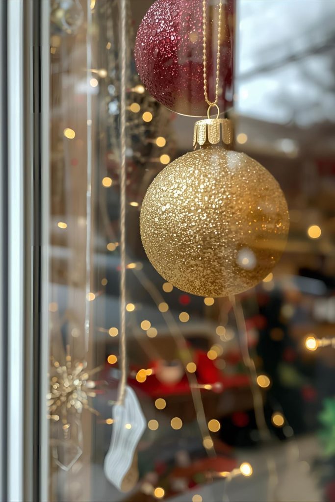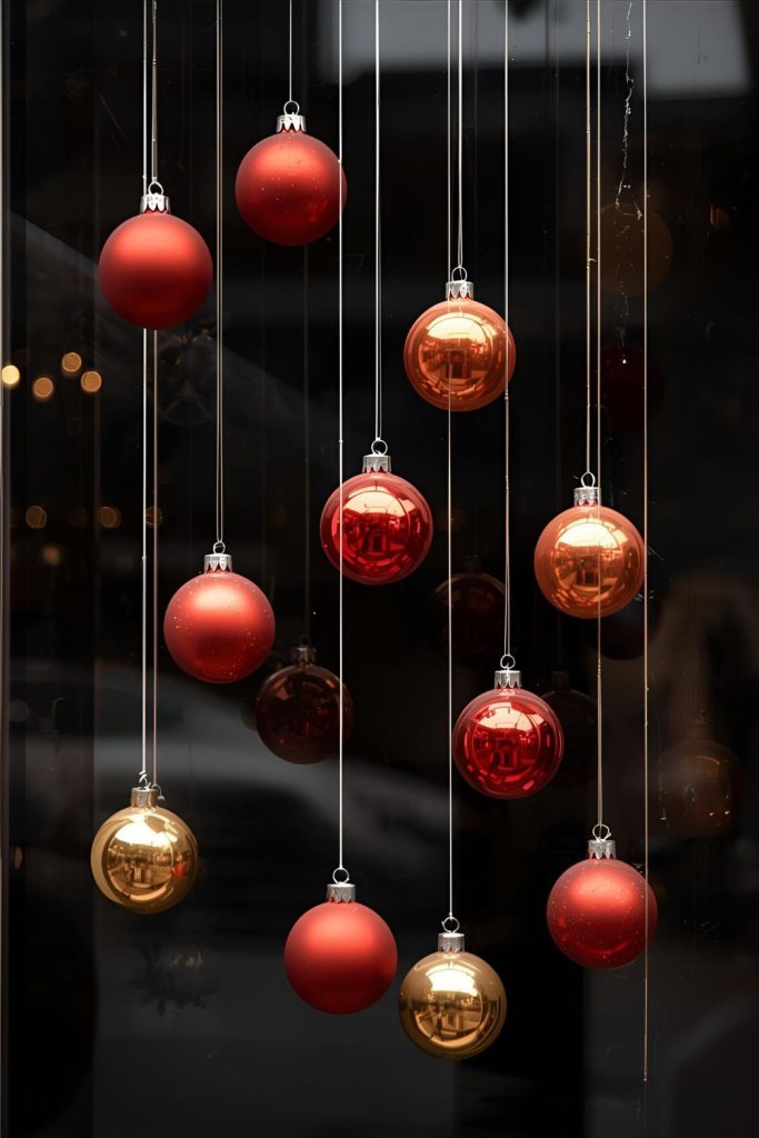 Hang red and gold Christmas balls at different lengths from the top of the window for a floating effect.