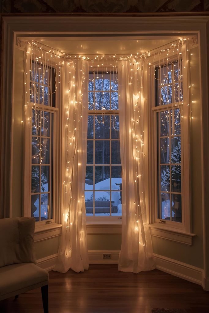 Style a big bay window with cascading lights, plush snow drapes, and a faux fireplace silhouette.