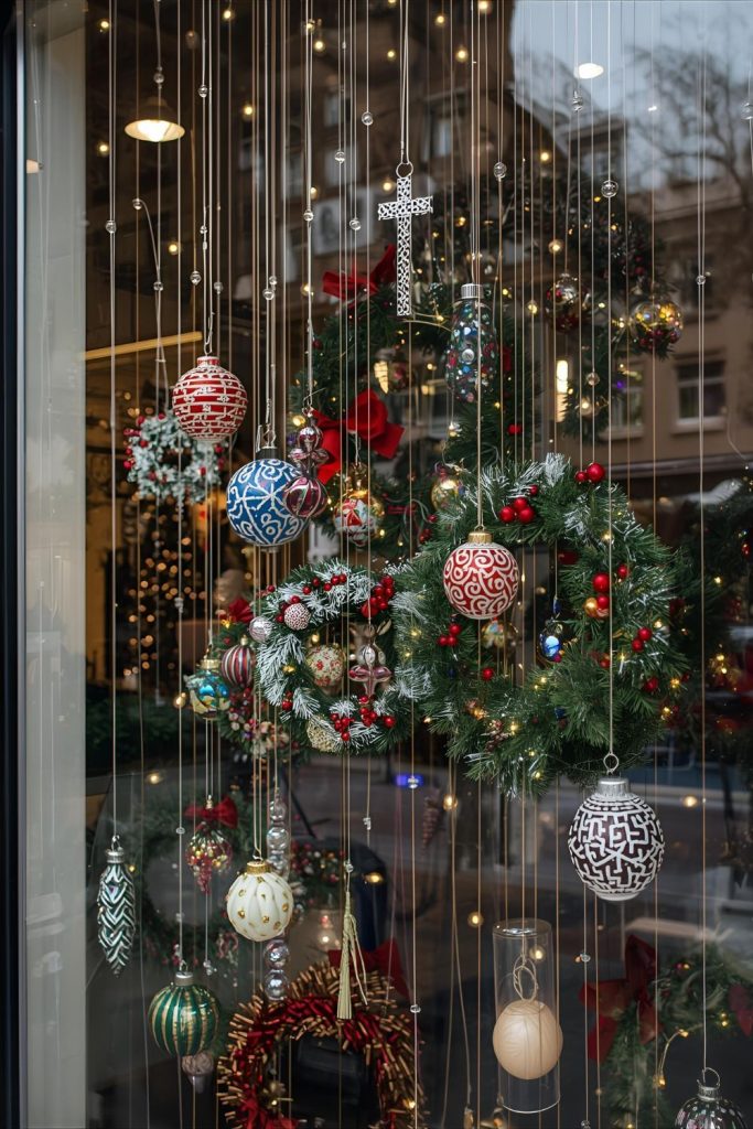 Ornaments and wreaths make bold statements when displayed in windows. To hang them without damaging surfaces, start with clear suction cup hooks designed for glass. They’re easy to place and remove. For heavier wreaths, consider using a tension rod inside the window frame to drape the wreath without touching glass or paint.