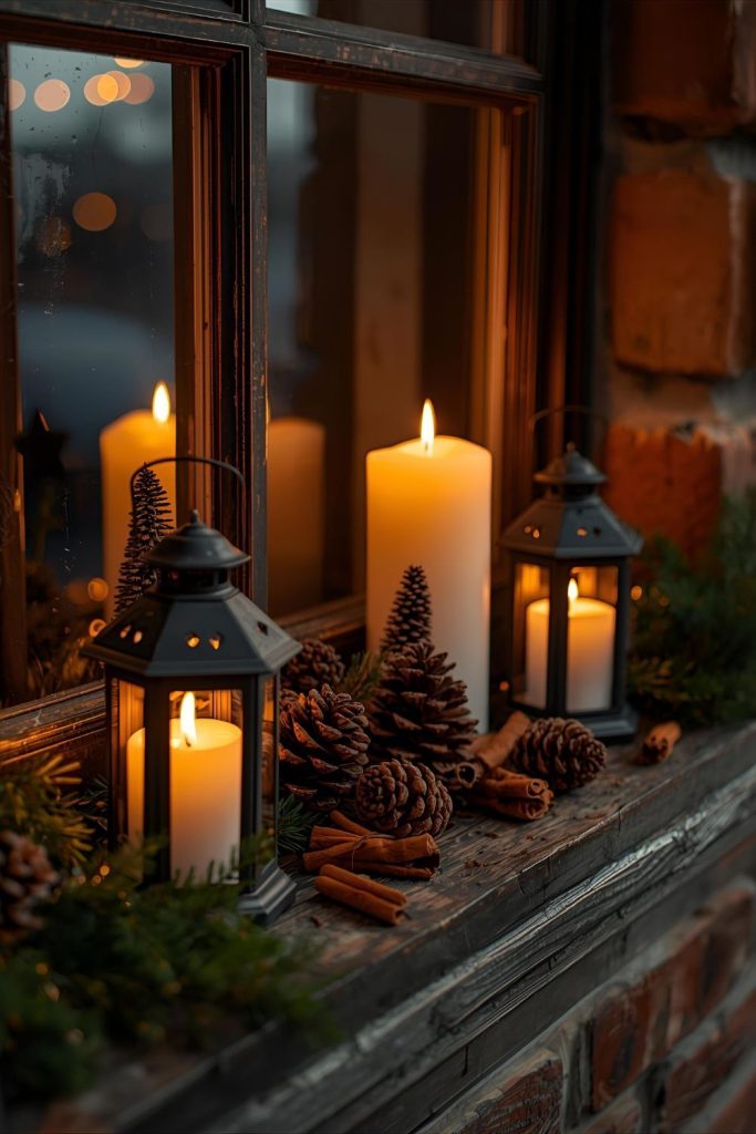 Windows aren’t just for looking out—they can host warm little scenes inside your home. Placing candle lanterns on the windowsill creates a soft, inviting glow when the sun goes down. Use flameless LED candles for safety, especially if you have kids or pets.