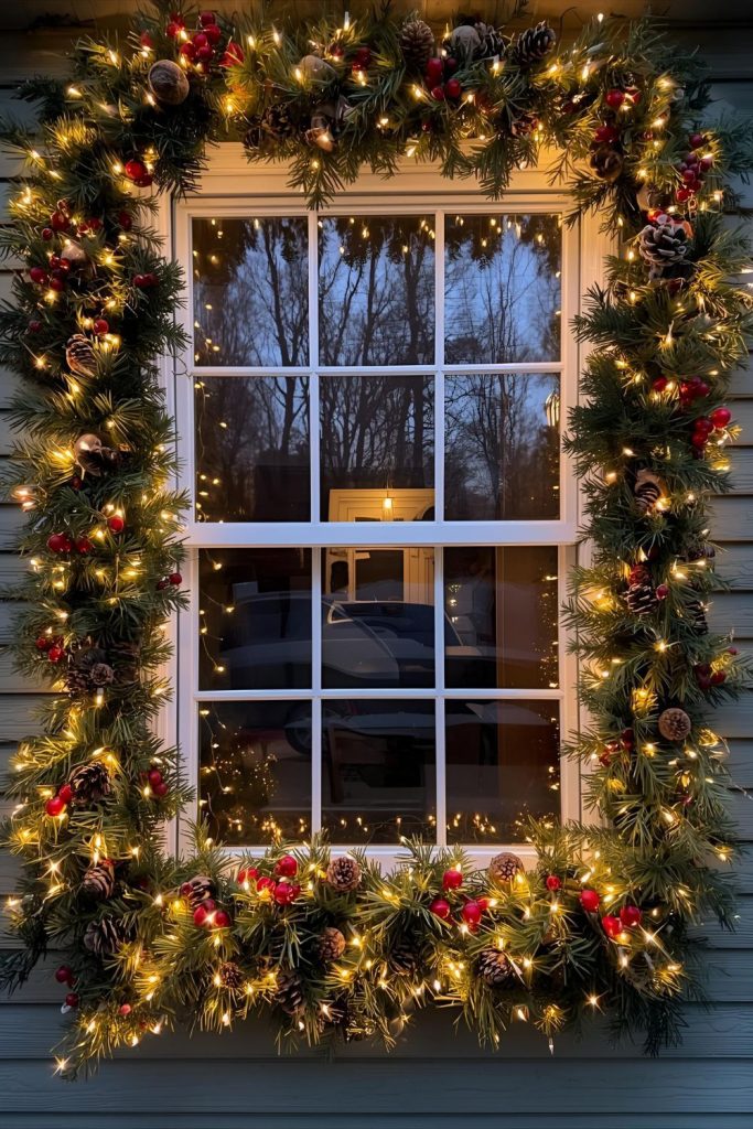 Frame your outdoor windows with fresh evergreen garland wrapped in twinkling fairy lights.