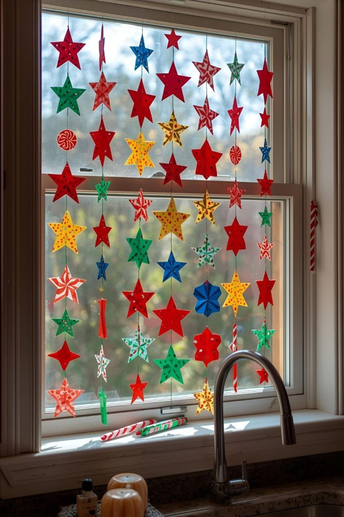 Kitchen windows are a great spot for bright, cheerful Christmas window decorations. Paper chains made from red, green, or gold paper strips are simple to make and add a fun retro touch. You can create chains of varying lengths and hang them across the window horizontally or vertically.