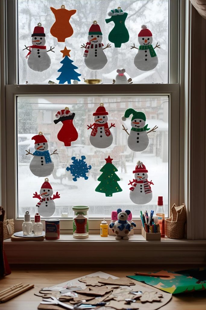 Creating felt snowmen is a wonderful way to get kids involved in Christmas window decorations. Set up a crafting station with colorful felt pieces, glue, scissors, buttons, and markers. Let kids cut shapes for snowmen, hats, scarves, and faces.