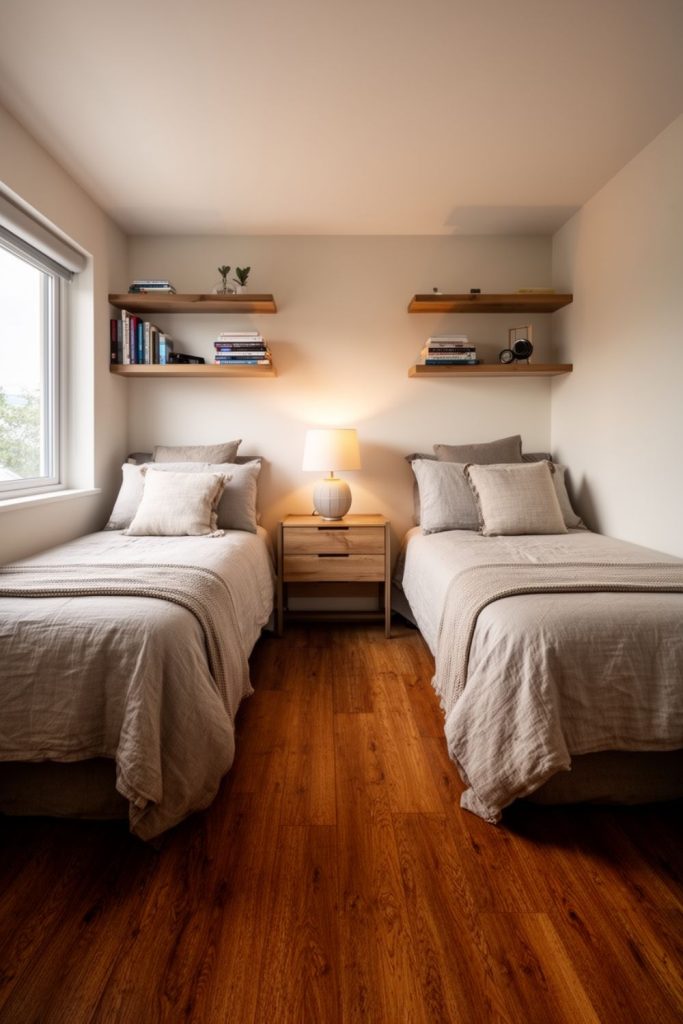 Arrange two twin beds with a shared nightstand to fit multiple guests in a small room efficiently