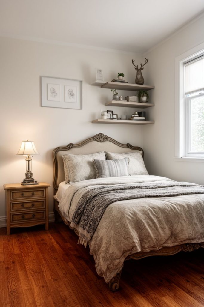 Add farmhouse-style floating shelves for decor and functional storage in a small guest room