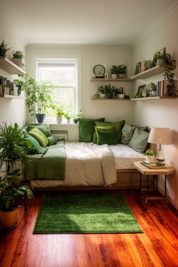 Green accents are a simple way to make a small guest bedroom feel fresh and inviting. Small potted plants on shelves or window sills bring nature indoors without taking up much space. Green pillows or a small area rug add pops of color while maintaining a cozy feel. Combining different shades of green with neutral bedding and furniture keeps the space balanced and visually appealing. Green also promotes a sense of calm and relaxation, enhancing the guest experience. This small guest bedroom idea is inexpensive, easy to implement, and works well in combination with other space-saving solutions like a twin daybed or floating shelves.