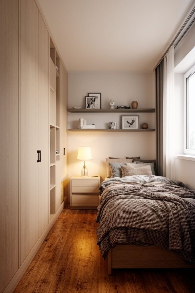 When combined with minimalist furniture and simple layouts, vertical storage can transform a small guest bedroom into an organized, functional, and visually appealing space that feels much larger than it actually is.