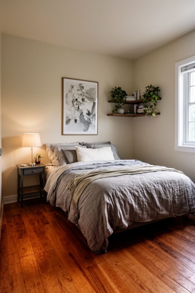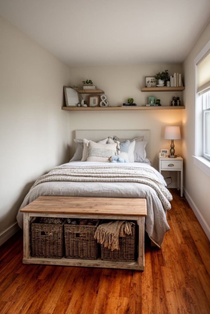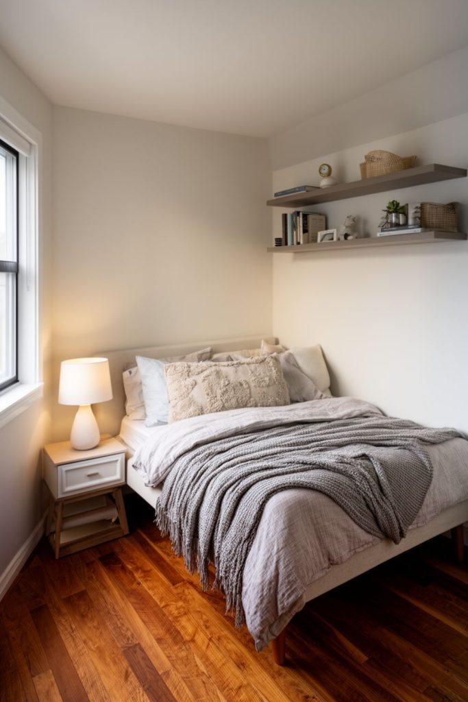 Farmhouse-style floating shelves are both decorative and practical, making them perfect for small guest bedroom ideas. They can hold books, framed photos, potted plants, or small personal items without taking up floor space. Using a natural wood finish adds warmth, while white or painted shelves can keep the room bright and airy. Shelves can be installed above beds, desks, or along unused walls to maximize vertical space. They also make organizing easier, keeping surfaces clear and reducing clutter. This simple addition gives a room personality while maintaining functionality. Combining floating shelves with other small guest bedroom ideas, like a twin bed or window seat, helps optimize every inch of the space.