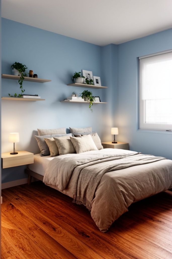 Blue-painted walls bring a calm and relaxing vibe to a small guest bedroom. Pairing the wall with floating bedside tables provides surface area for lamps, clocks, or decor without taking up floor space. Soft or muted shades of blue work best in small spaces, keeping the room feeling airy and open. Coordinating bedding, rugs, or accents with the wall color ties the room together and adds personality. Floating tables also make cleaning easier and prevent the room from feeling crowded. This small guest bedroom idea combines aesthetic appeal with practicality, giving guests a comfortable and visually pleasing space to relax or sleep.