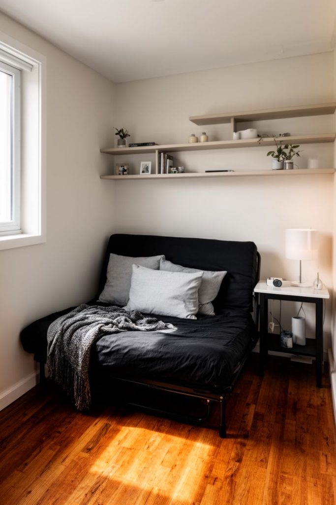 A foldable black sofa is ideal for small guest bedroom ideas where versatility is key. During the day, it serves as seating for reading, working, or relaxing. At night, it converts into a bed for overnight guests, offering convenience without sacrificing floor space. Black upholstery is sleek, modern, and coordinates with many decor styles. Adding a small throw or cushion softens the look and enhances comfort. This small guest bedroom idea works well alongside floating shelves, compact desks, or window seats, creating a flexible space that adapts to guests’ needs. Even in a tiny room, a foldable sofa ensures the area remains multifunctional while stylish.