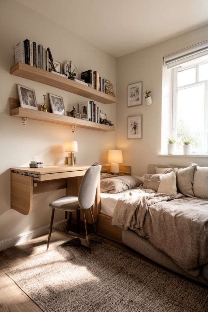 In small guest bedroom ideas, a wall-mounted foldable desk is a smart solution for those who need a workspace. When folded down, it provides enough surface for a laptop or writing, but when folded up, it frees floor space completely. Adding a small chair that tucks under the desk keeps the area tidy. Floating shelves above the desk can store office supplies or display decorative items. This setup allows the room to serve as both a home office and a guest bedroom without feeling overcrowded. Using light-colored materials or minimalistic design ensures the desk blends seamlessly into the room while still being functional.