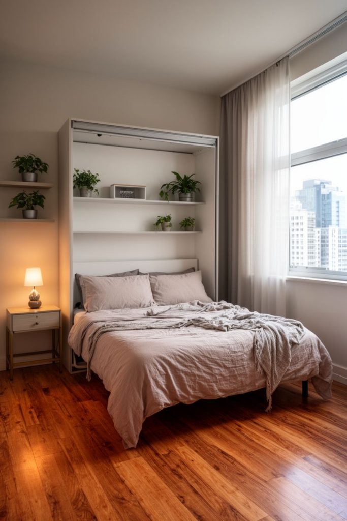 A queen Murphy bed is ideal for very small guest bedrooms where floor space is at a premium. During the day, the bed folds into the wall, freeing space for other activities like exercise, reading, or seating. Some Murphy beds include built-in shelving or cabinets, giving additional storage for books, blankets, or decor. Pairing the bed with wall-mounted lighting or a small side table maximizes functionality without cluttering the room. A neutral finish keeps the room bright, while adding a few accent pillows ensures comfort for guests. This small guest bedroom idea is both practical and stylish, perfect for NYC apartments or compact homes.