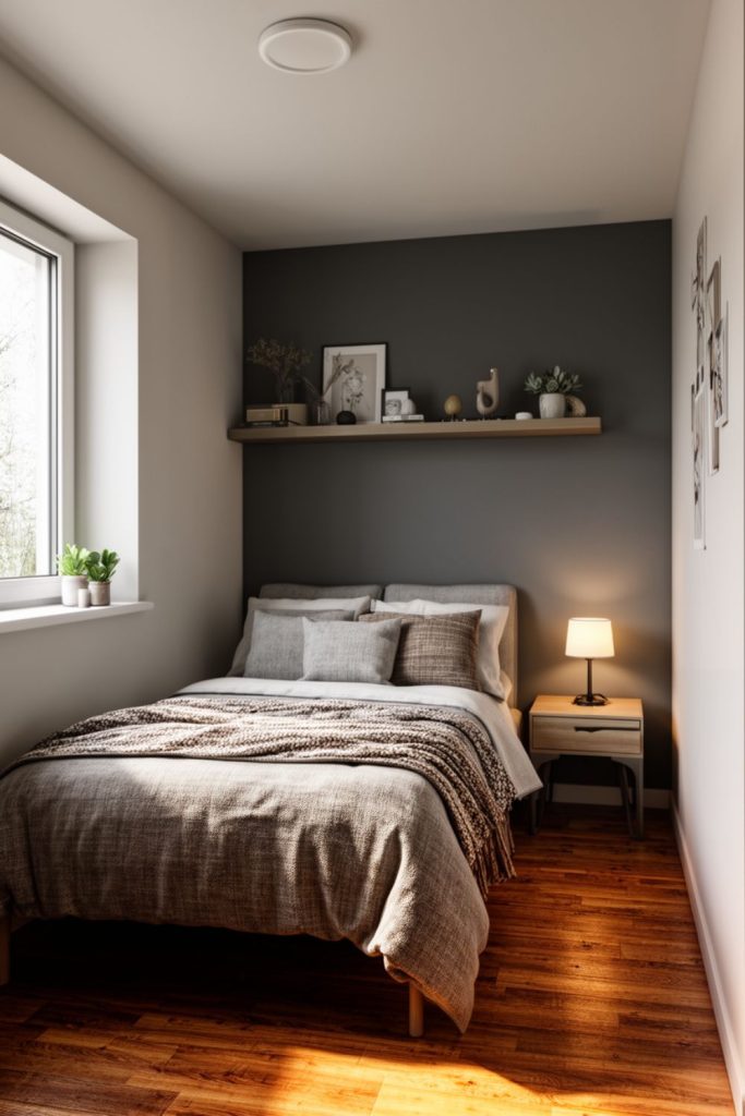 Using a dark grey accent wall in a small guest bedroom can instantly give the space a modern and elegant feel. Unlike painting the entire room dark, one wall creates depth and contrast without making the room feel cramped. Dark grey pairs well with light bedding, white furniture, or natural wood, balancing sophistication and warmth. You can highlight the wall behind a bed, a window seat, or a desk area to create a focal point. Small touches like gold or brass accents, soft lighting, or a few plants help the dark grey feel cozy instead of heavy. This small guest bedroom idea combines style and practicality, giving the room personality while keeping other surfaces light and airy.