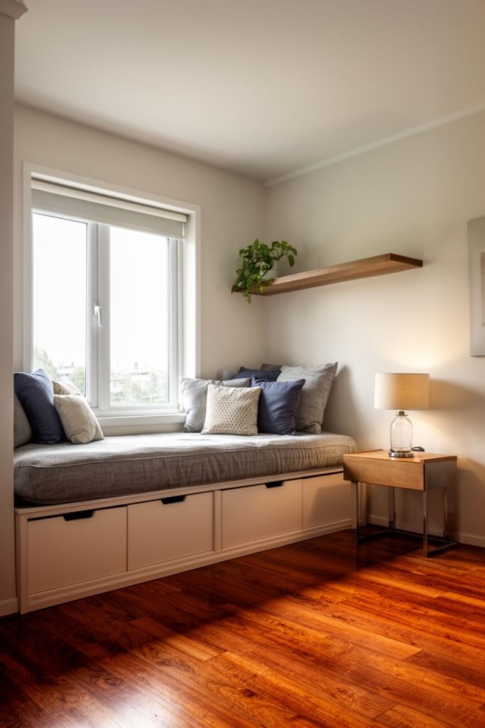 A window seat with hidden storage is perfect for turning an unused corner into a functional and inviting spot. Guests can sit, read, or relax while enjoying natural light, and underneath, you can store blankets, pillows, or extra linens. The seat can be cushioned with soft pillows or a cozy throw to make it extra comfortable. This setup works especially well in small guest bedroom ideas where every inch matters, as it uses vertical and horizontal space efficiently. Adding small decorative accents like potted plants or a lamp enhances the comfort while keeping clutter to a minimum. A window seat makes the room feel homier and multi-functional without sacrificing square footage.