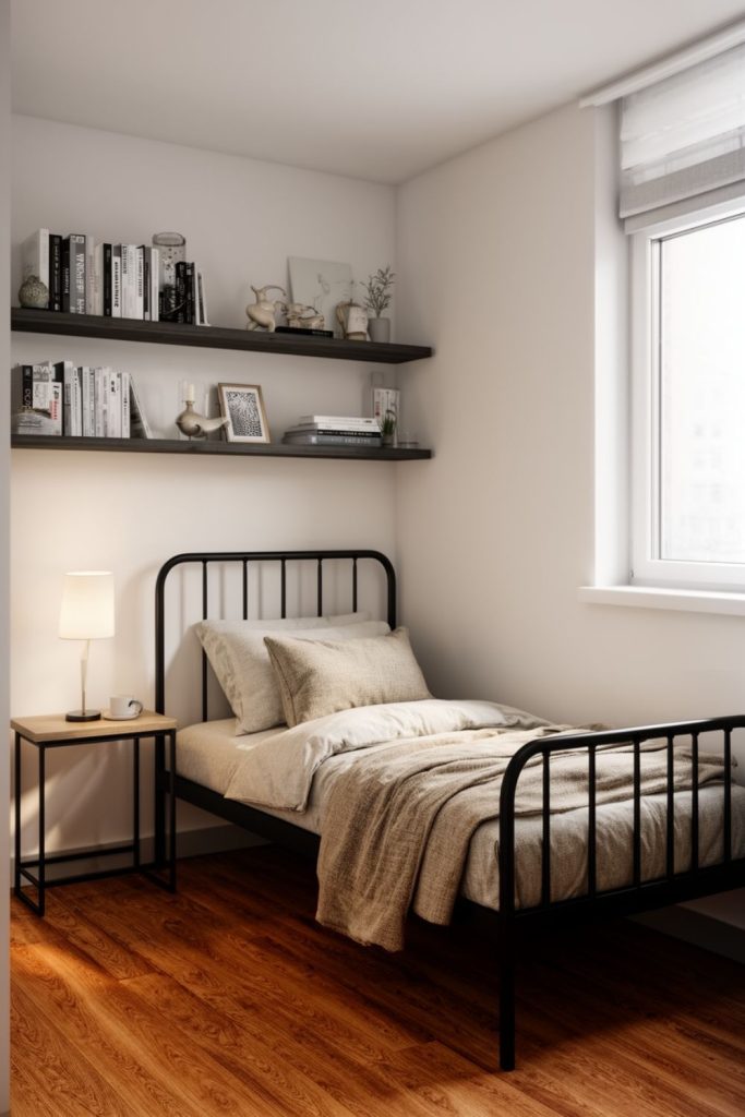 Pairing a black metal single bed with floating shelves adds a minimalist look while providing a place for books, decor, or personal items without cluttering the floor.