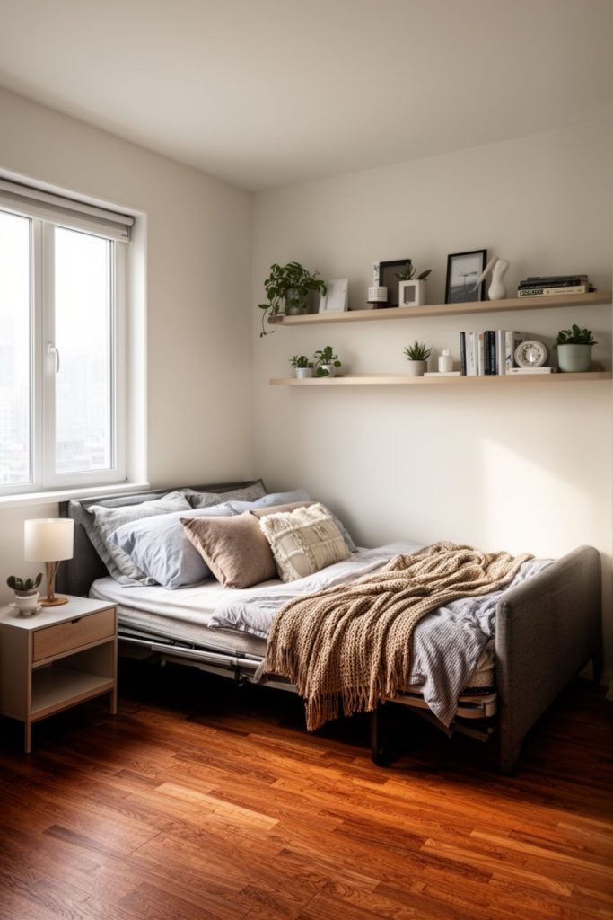 A vintage-style bed with elegant bedding adds sophistication without clutter. Using a small sofa bed with a pull-out mattress ensures flexible sleeping arrangements without crowding the room.