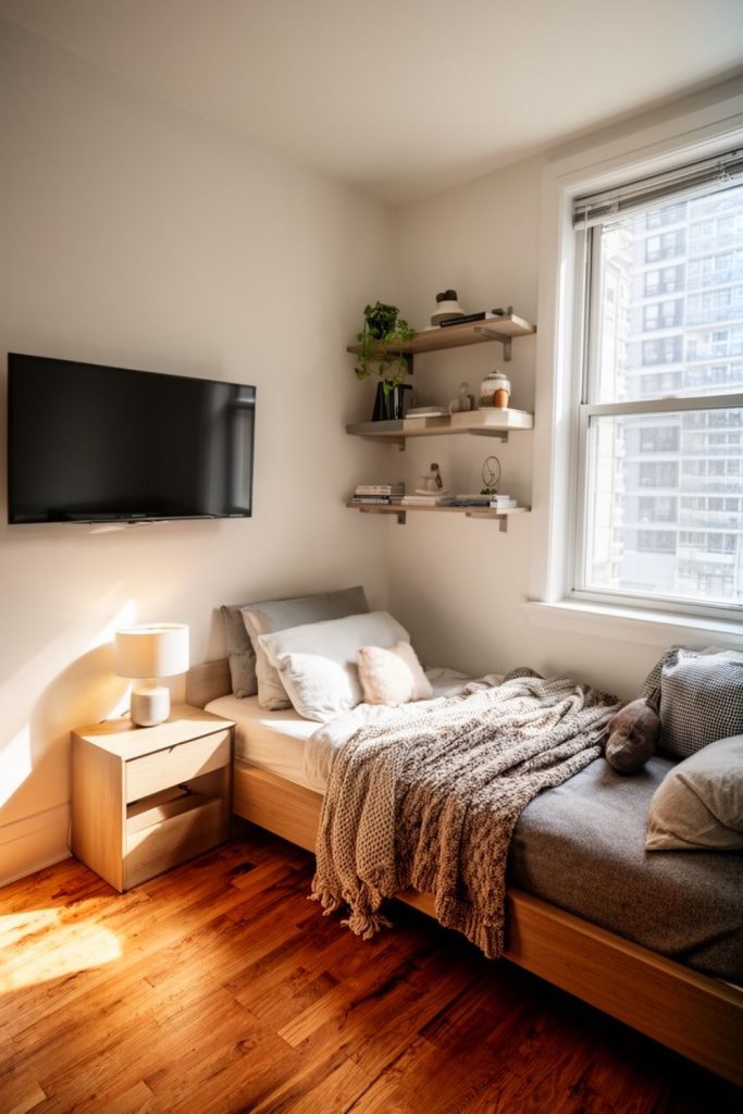 Window shelves or hanging organizers can hold personal items while keeping surfaces clear. Vertical storage also draws the eye upward, making the room feel taller and less cramped.
