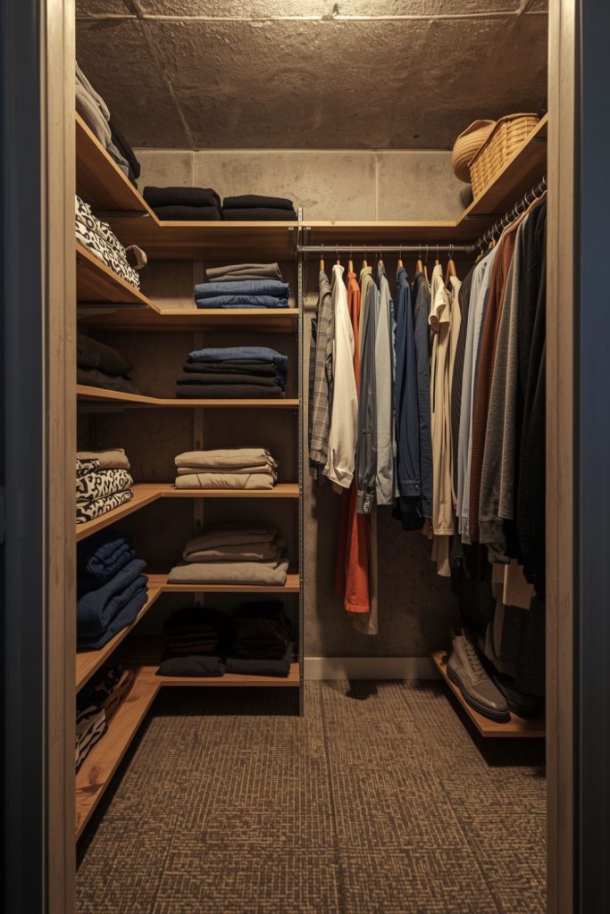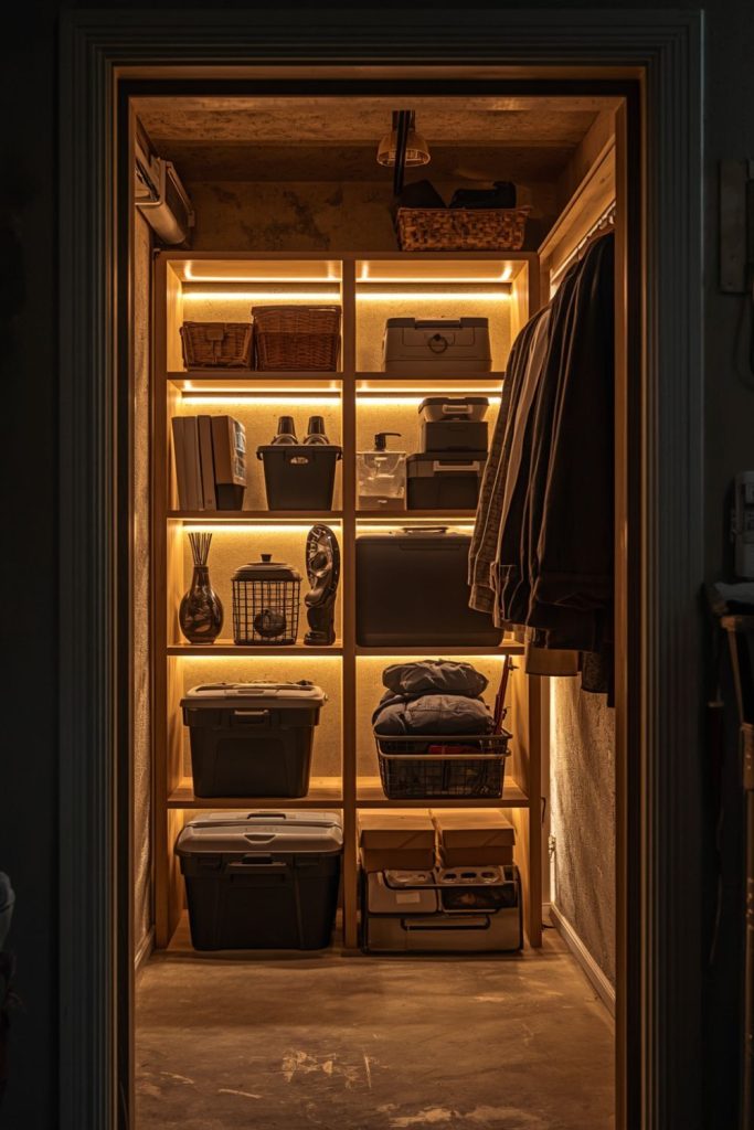 Lighting inside the closet can add another layer of depth. When shelves are softly lit, the entire basement gains a more polished appearance. It doesn’t feel like a storage area anymore, it feels more intentional.