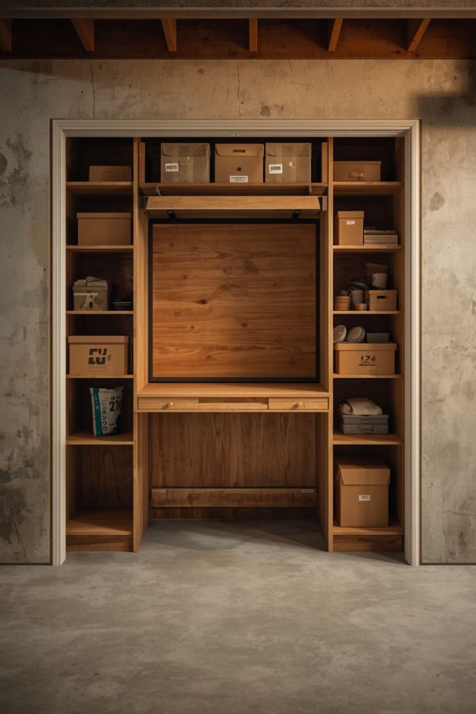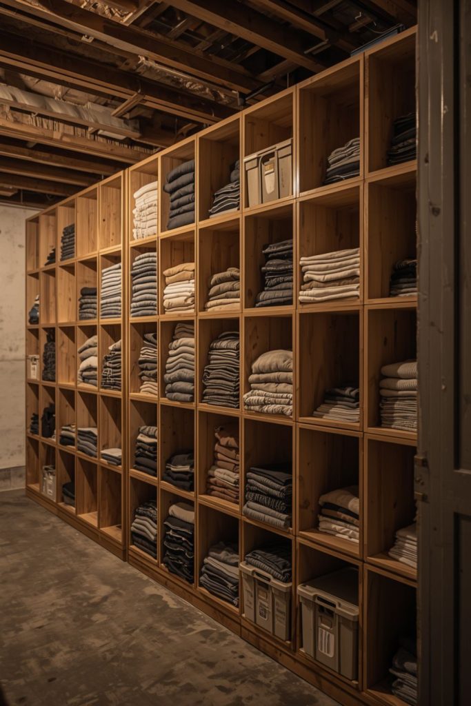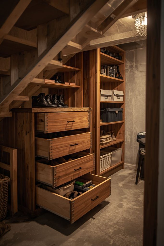 This idea works especially well in compact homes where every inch matters. Instead of letting the space go unused, it becomes one of the most efficient storage zones in the basement.