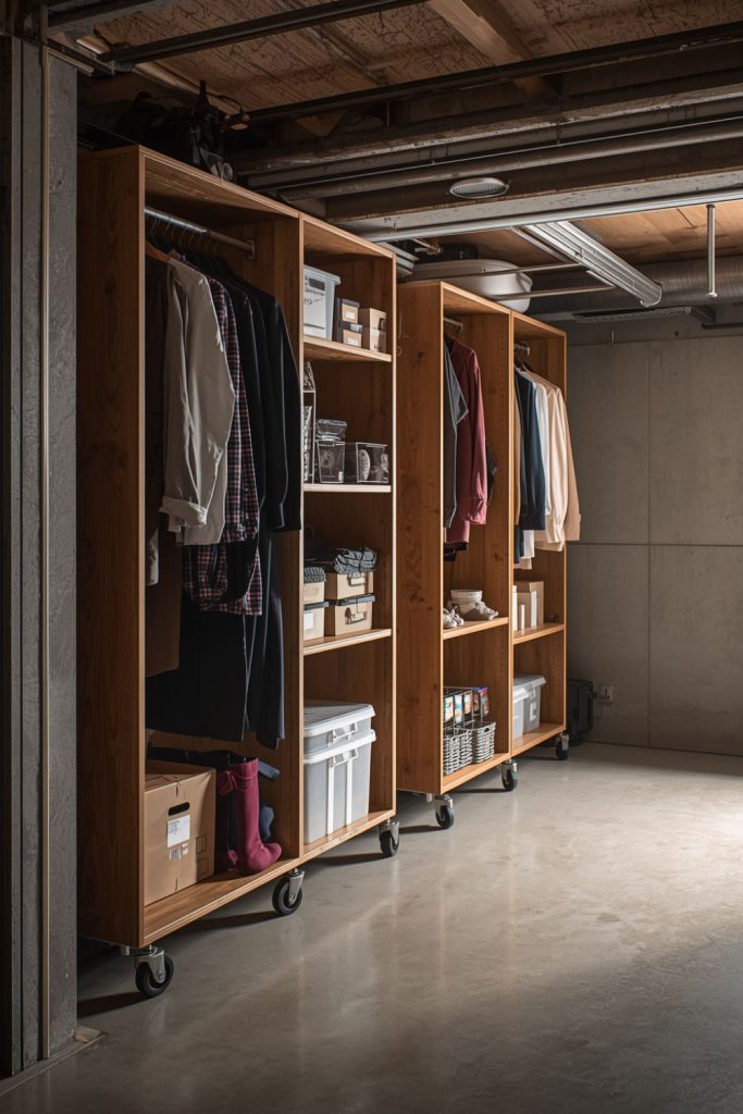 Rolling closet units on casters for flexible, movable basement storage solutions