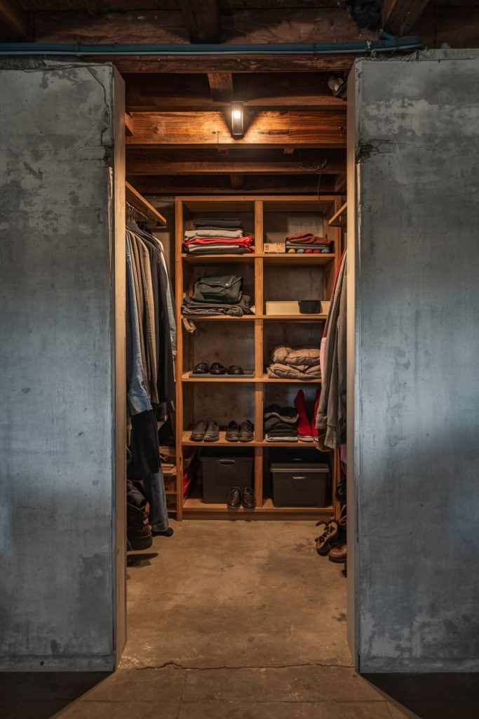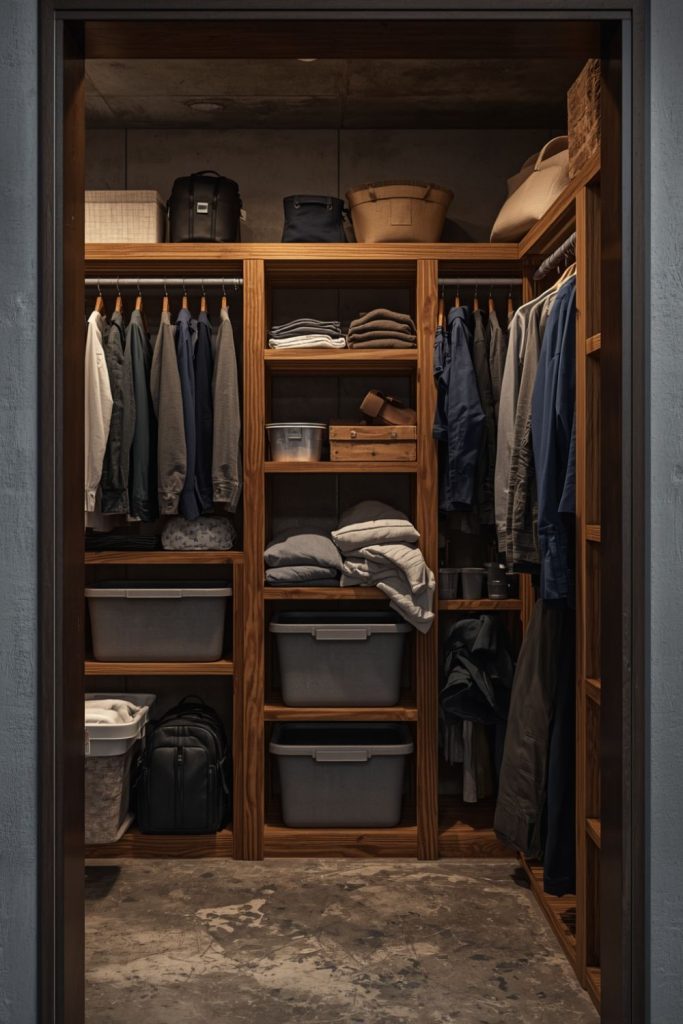 Reclaimed wood adds character to basement closets. Its natural texture contrasts with the often cold and plain surfaces found in basements.