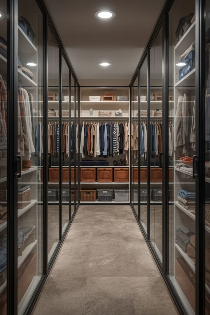 Floor-to-ceiling glass-paneled basement closets that visually expand tight, dark spaces