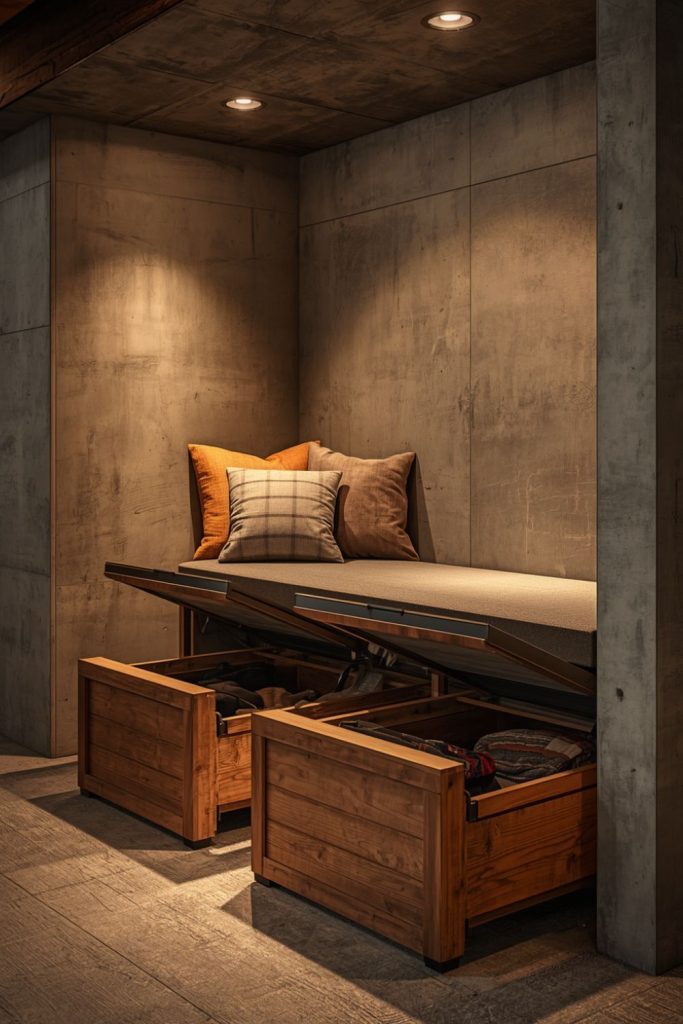 These benches can be built along walls or tucked into corners. This helps maintain open floor space while still adding storage. Cushions or upholstery can be added for comfort, bringing a warmer feel to the basement.