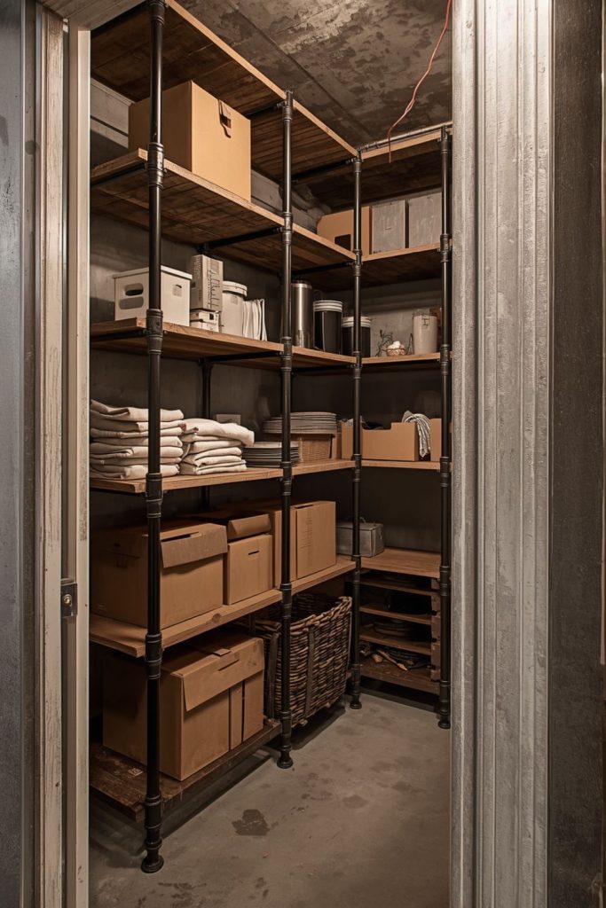 The style also adds personality. Instead of hiding storage, it becomes part of the room’s look. This works well in unfinished basements where exposed materials already exist.