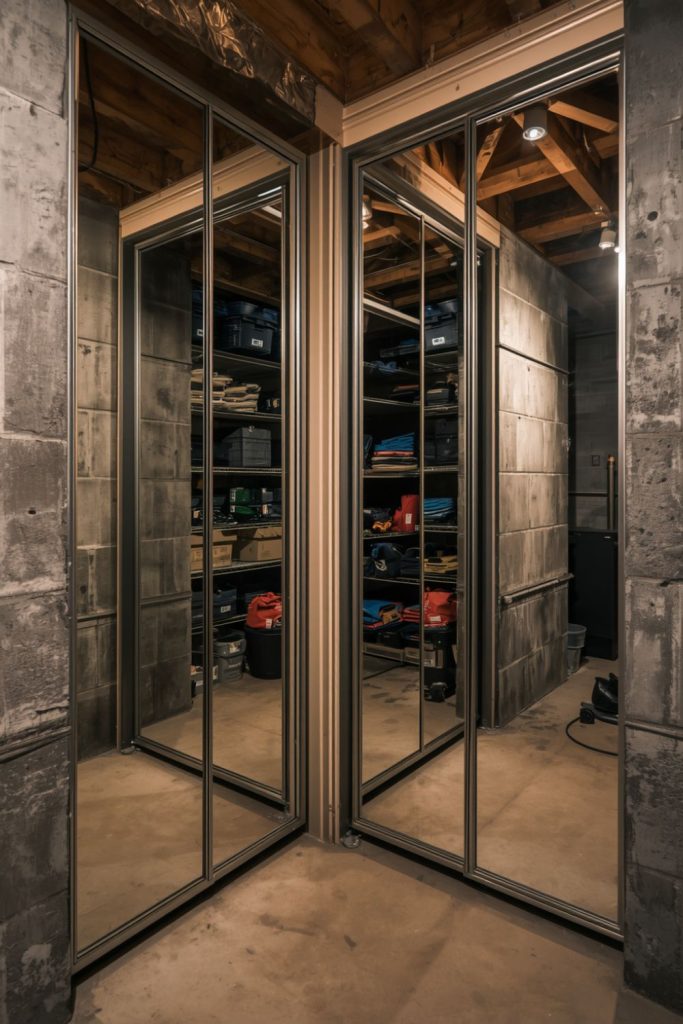 Mirror-lined closet doors that reflect light and make small basements feel twice as large