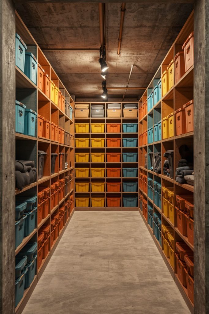 Visually, they create a structured grid that feels organized and balanced. When arranged neatly, they add a sense of order to the basement.
