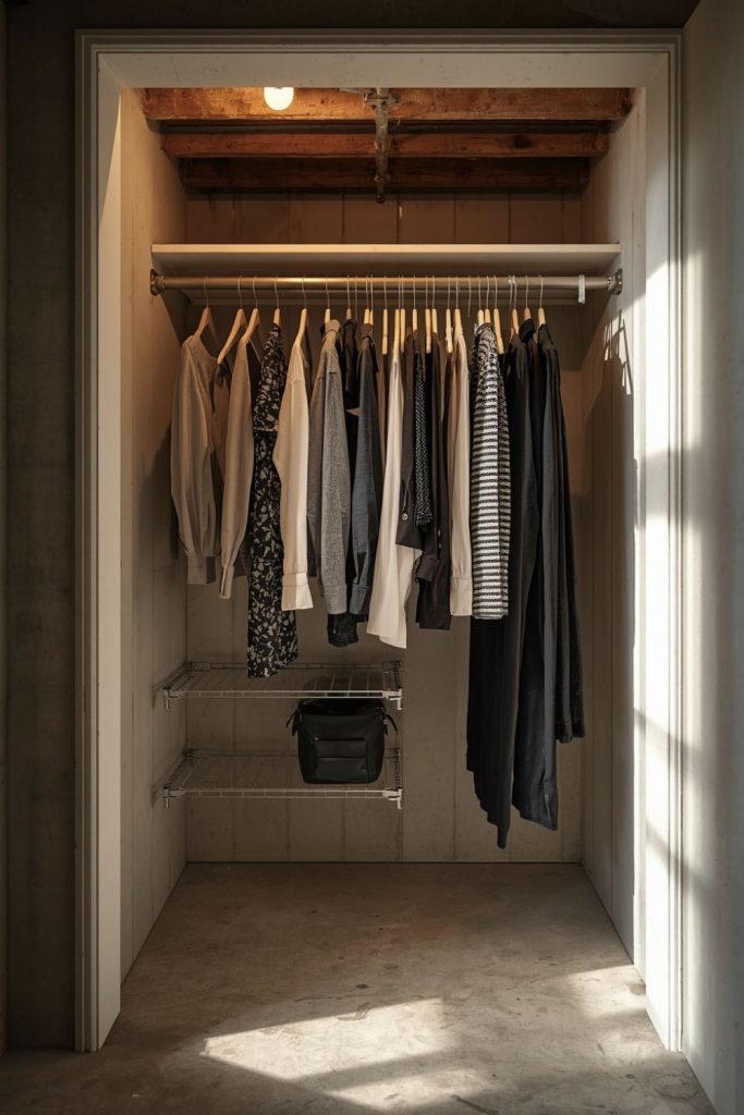 Compact “capsule wardrobe” basement closets designed for simplicity, style, and efficiency
