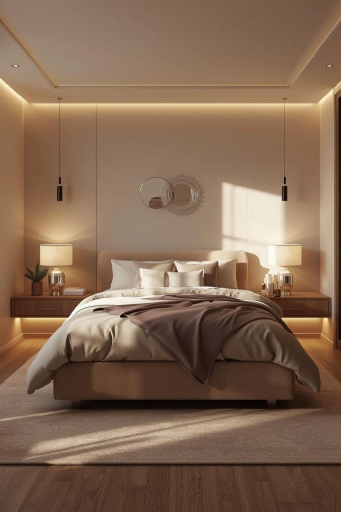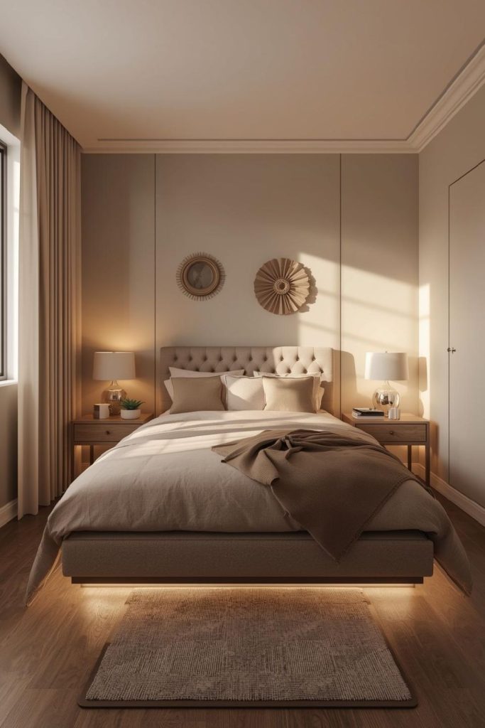 This setup works especially well in apartments where space is tight. The glow from hidden lighting creates a cozy atmosphere while keeping surfaces clear. Floating nightstands also make cleaning easier, which is a bonus in compact rooms. Pair them with a simple headboard and neutral bedding to keep the look balanced. The result feels polished, modern, and subtly feminine without trying too hard.