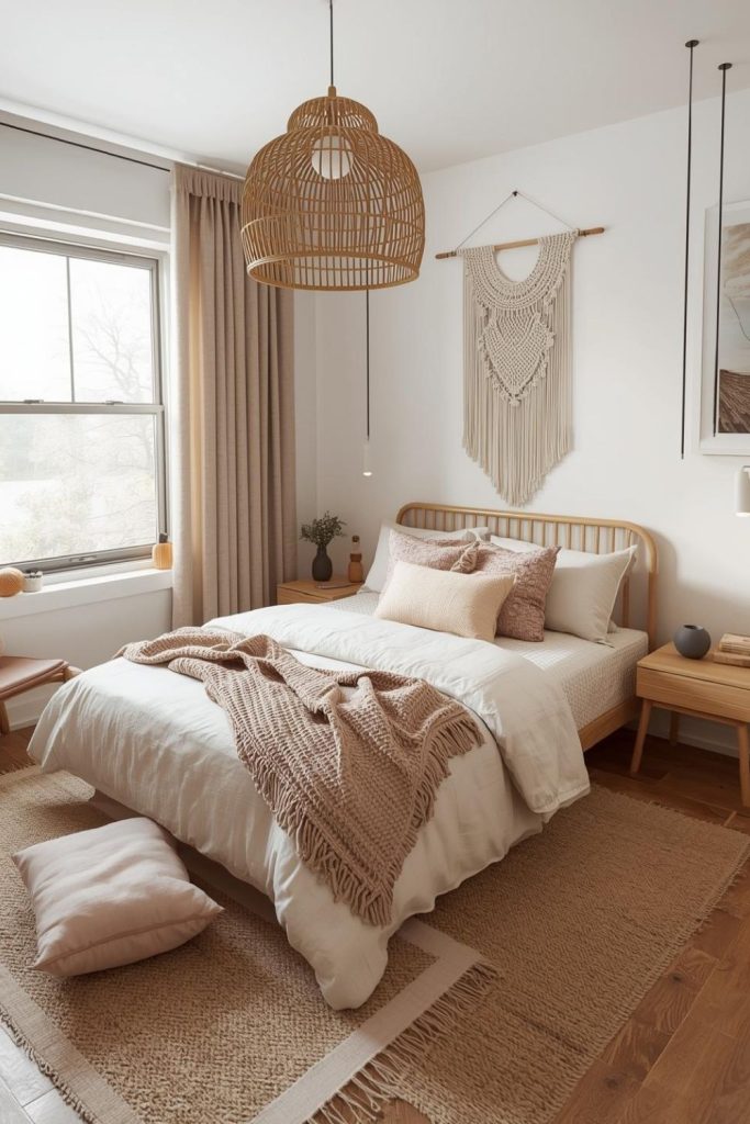 Boho inspired textures bring warmth and personality into a small bedroom. Small bedroom ideas for women use woven elements like rattan, jute, and macrame to soften modern spaces. These textures add depth without relying on bold colors.