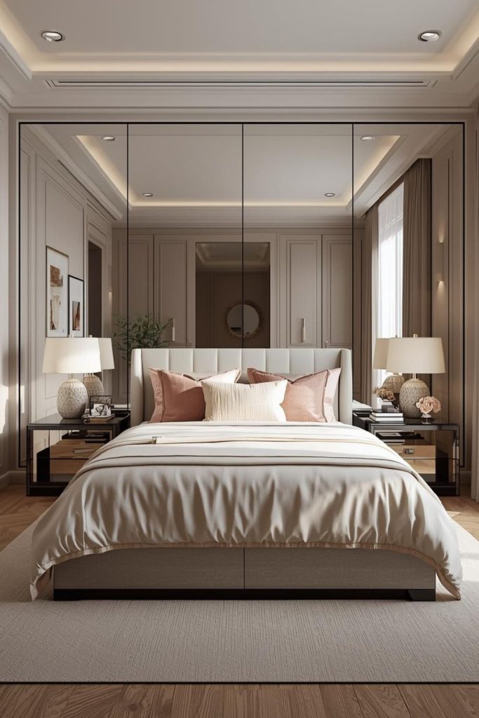 Small bedroom ideas for women highlighting a luxury mirror wall to amplify space