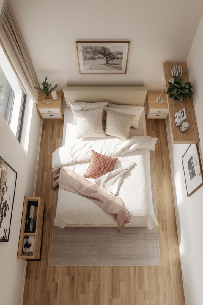 Symmetry is not always the best choice in small rooms. Small bedroom ideas for women sometimes use asymmetrical layouts to make better use of space. Placing a nightstand on one side and a wall shelf on the other can free up room without looking awkward.
