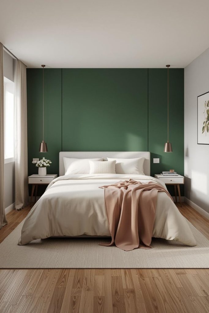 This works especially well behind the bed, creating a focal point without crowding the room. Plants and natural textures complement the color, tying the room together naturally.