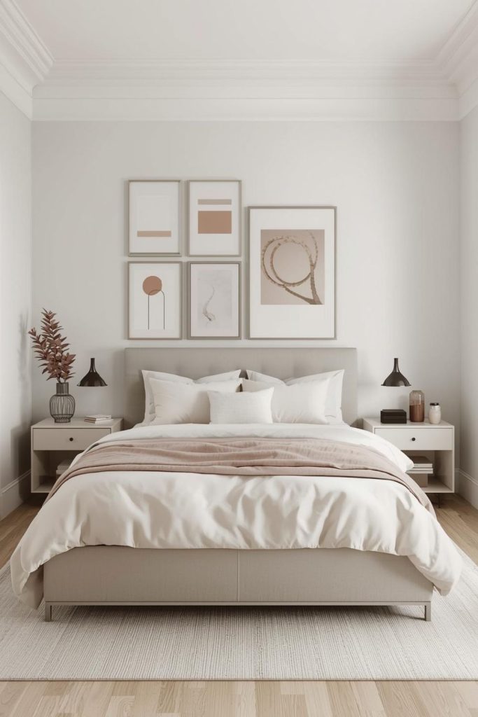 Choose art that reflects your taste, whether that is photography, line art, or soft abstracts. Spacing matters more than quantity. A balanced arrangement keeps the wall from feeling heavy.