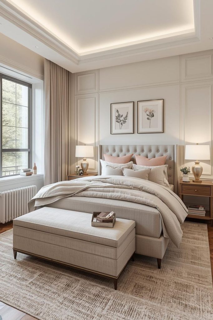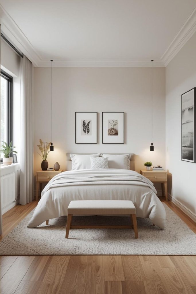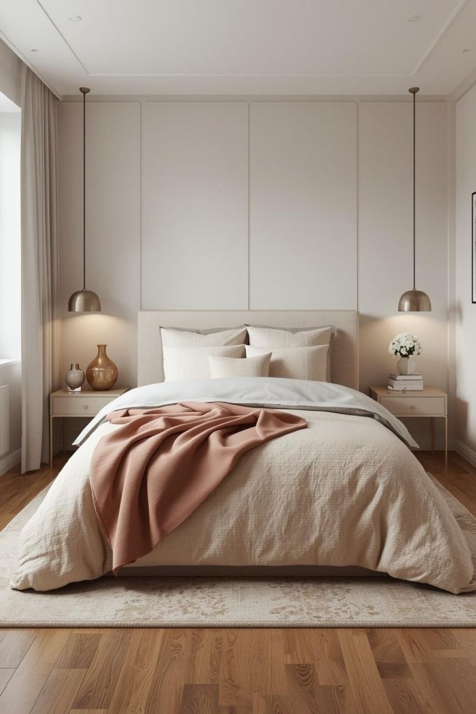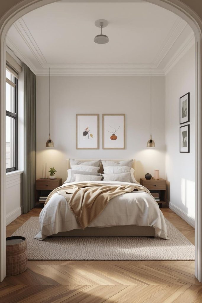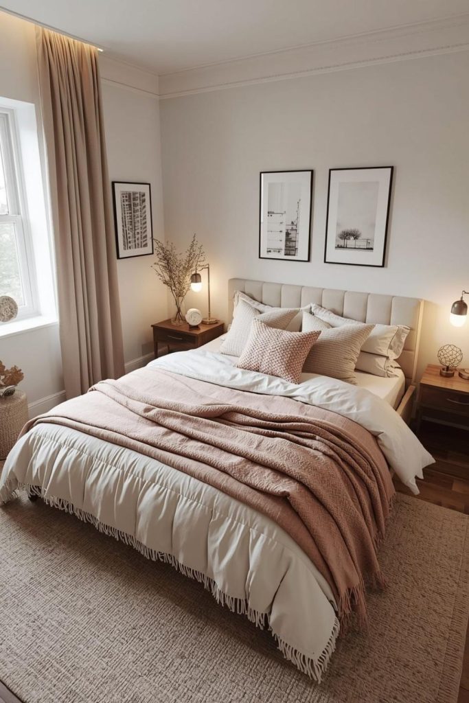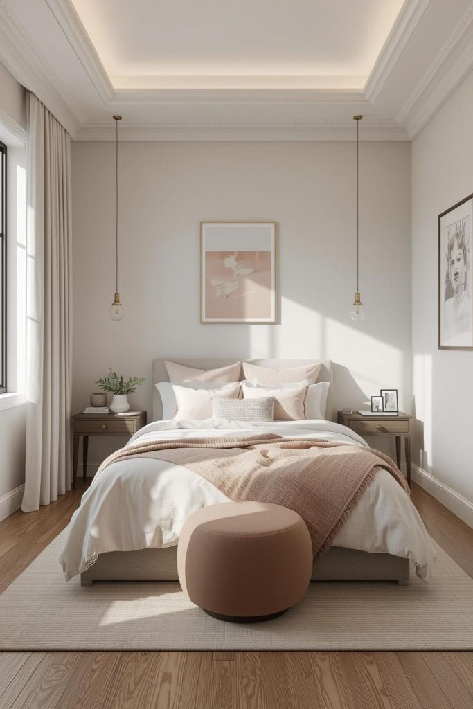 Layered neutrals create peace. Small bedroom ideas for women use beige, cream, and soft gray to build warmth. Texture keeps the palette from feeling flat.