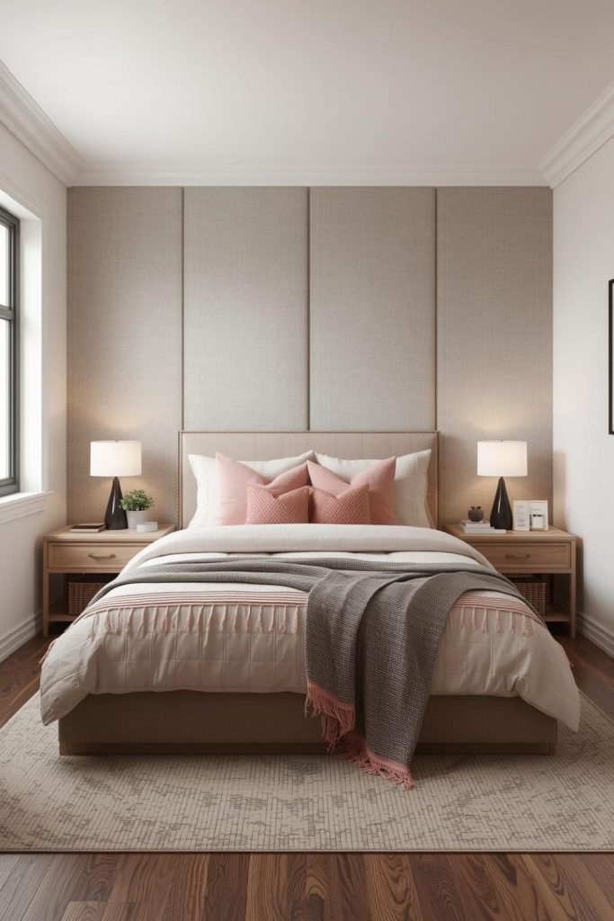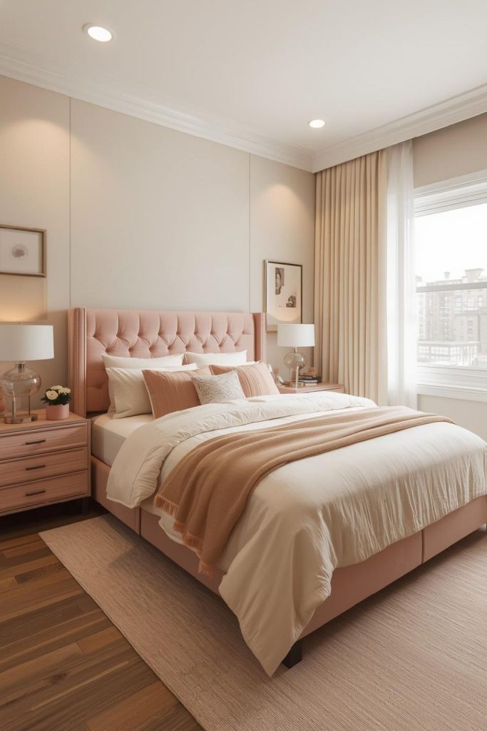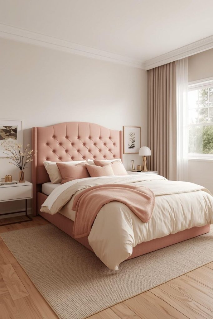 This approach works well in rental spaces because it does not require permanent changes. Pair the headboard with white or cream bedding to keep the look light. Metallic accents like brass lamps or frames complement pink tones beautifully. The result feels feminine, chic, and cozy while still fitting into a modern apartment aesthetic.