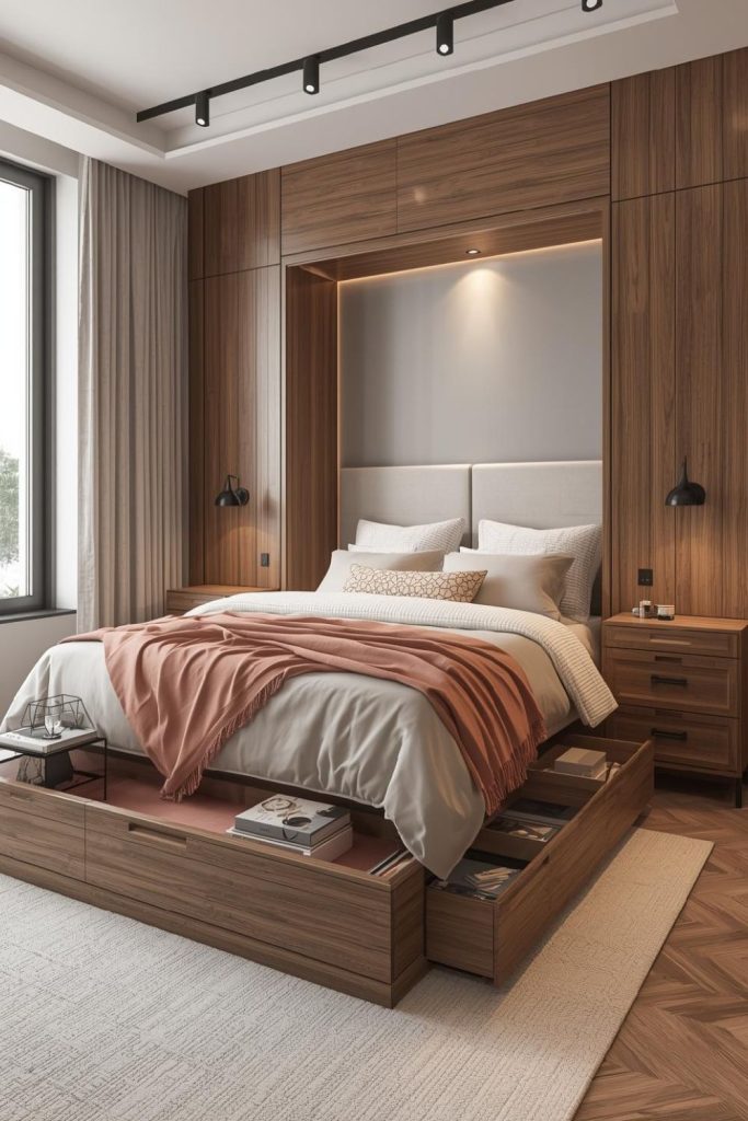 Beds with drawers offer hidden storage. Small bedroom ideas for women use them to store clothing or linens without extra furniture. This keeps the room open and tidy.