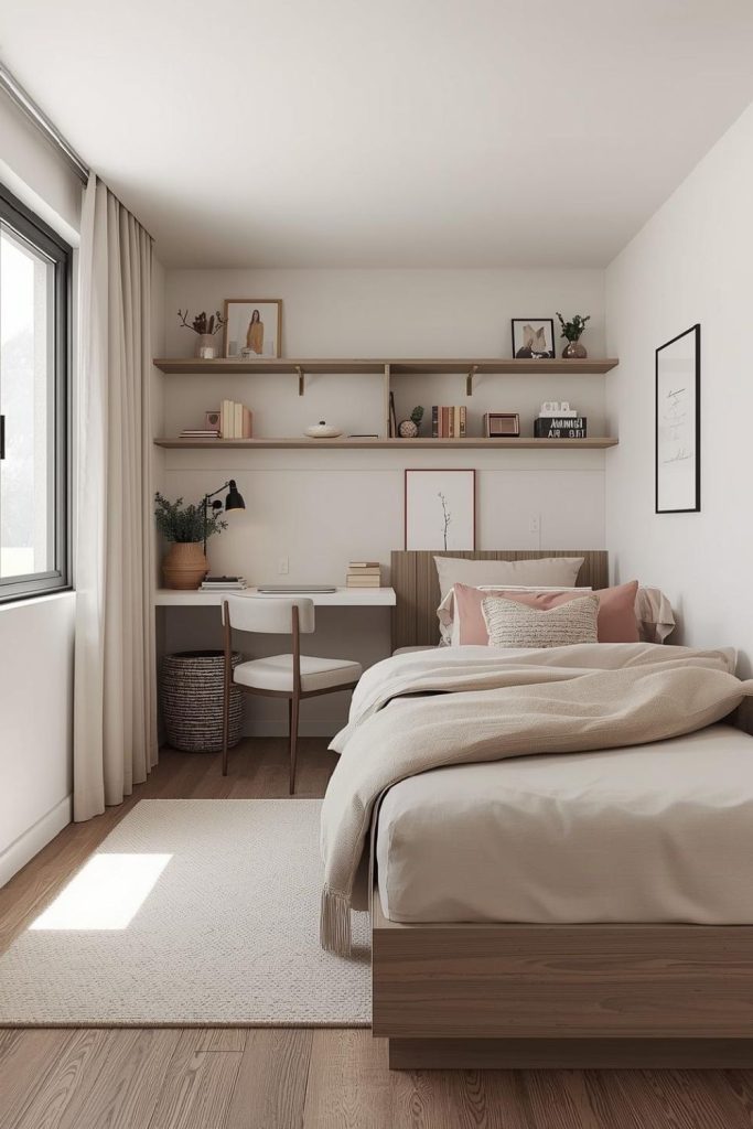 Small bedroom ideas for women using minimalist wall mounted shelving as decor