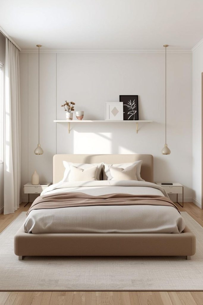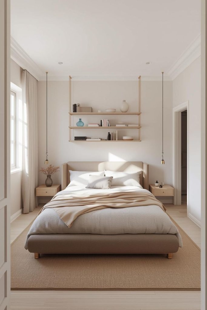 Choose shelves with clean lines and neutral finishes. Styling matters just as much as placement. A small plant, a framed photo, and a book or two often look better than filling every inch. Leaving negative space around objects helps the room breathe. Minimalist shelving adds personality without visual weight, making it ideal for modern and feminine bedrooms alike.