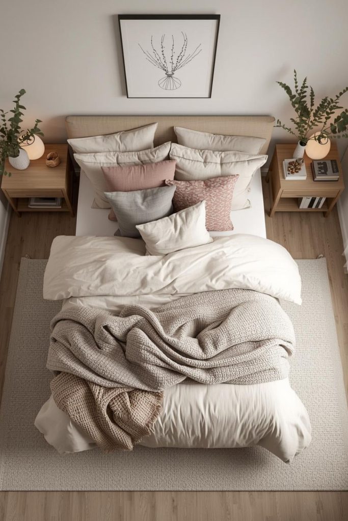 Stick to a cohesive color palette to keep the bed from feeling busy. Soft creams, muted blush, warm gray, or sage work well together. Texture does most of the work here, adding depth without extra decor. A well styled bed becomes the heart of the room, making the entire space feel more inviting and put together.