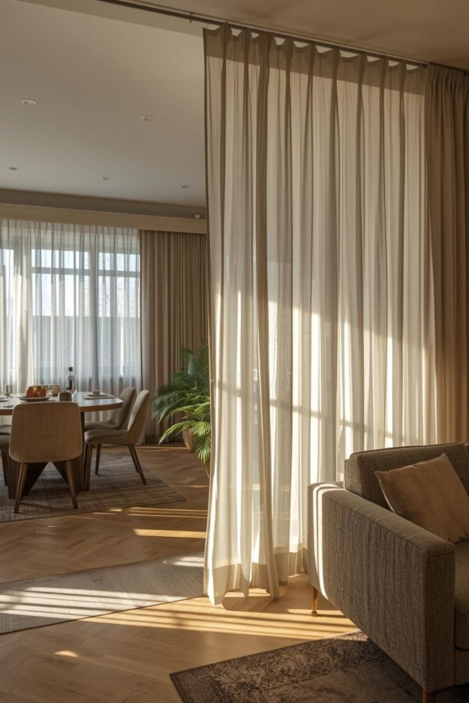 Using sheer curtains to visually separate living and dining areas in open plan spaces
