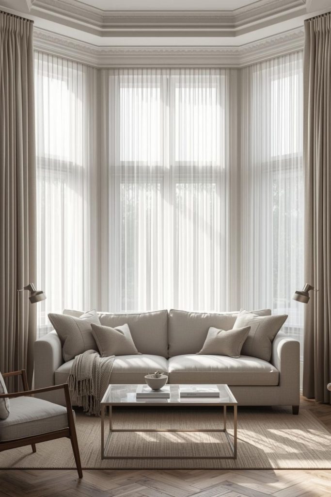 Bay windows invite light from multiple angles. Sheer curtains living room designs work especially well here. The fabric follows the shape of the window, softening the structure. Light moves freely through each panel, filling the room evenly. Sheer curtains living room installations in bay windows prevent glare without blocking views. The space feels bright and welcoming throughout the day.