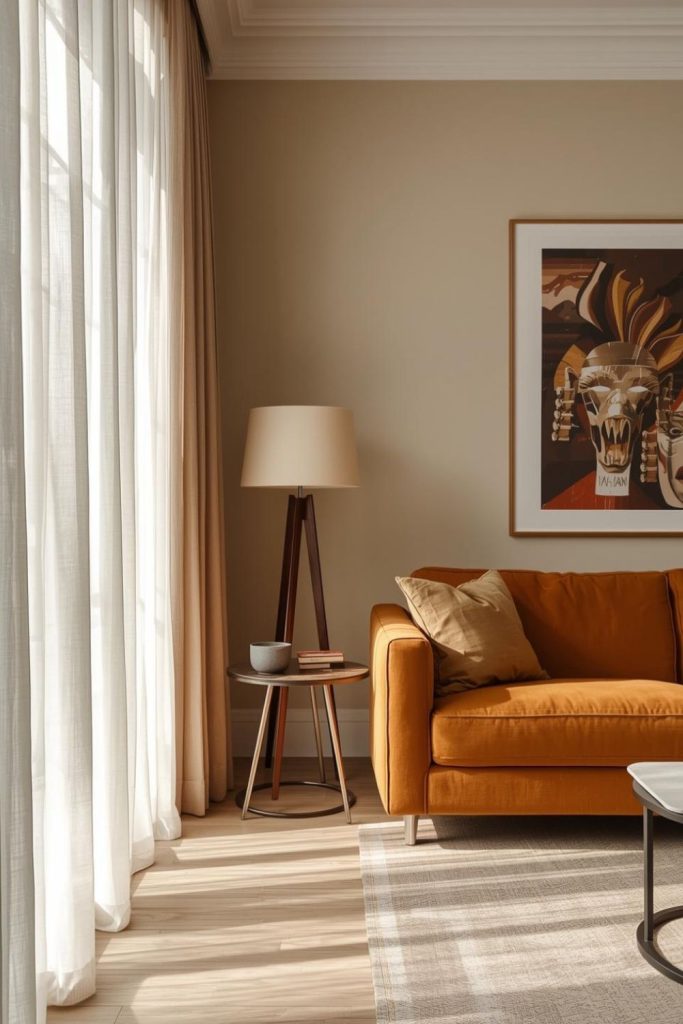 Neutral sheer curtains as a backdrop for bold accent furniture and artwork