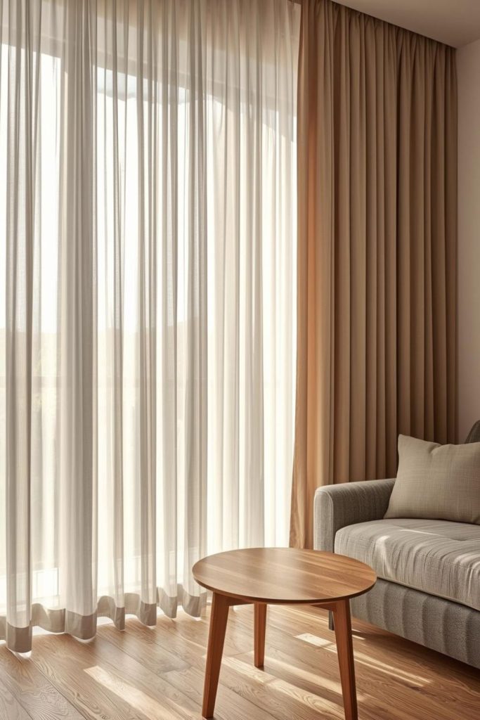 Pairing sheer curtains with natural wood tones for a warm modern look