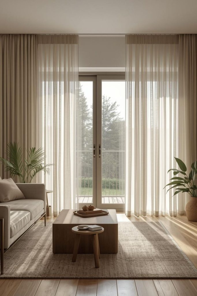 Sliding doors benefit from lightweight framing. Sheer curtains living room designs outline the doorway without blocking movement. The fabric stacks neatly when open. This keeps access clear while softening the glass surface. Sheer curtains living room styling around doors feels natural and uncluttered.