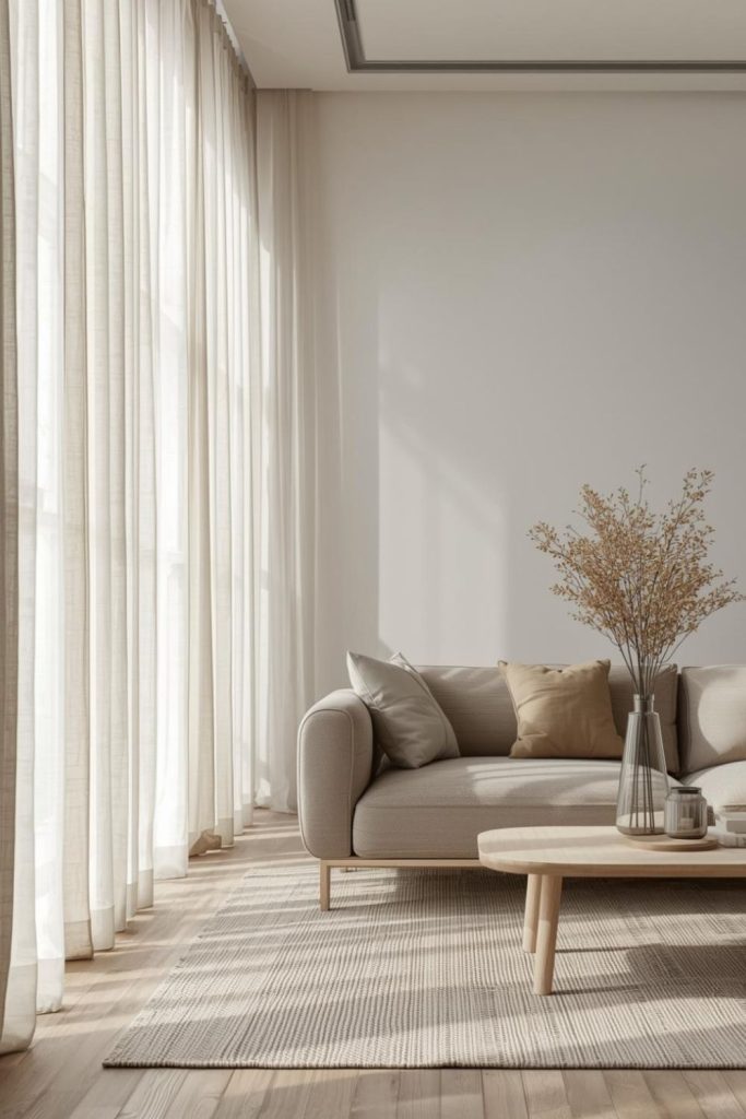 Choosing linen sheer curtains to add texture to minimalist living room interiors