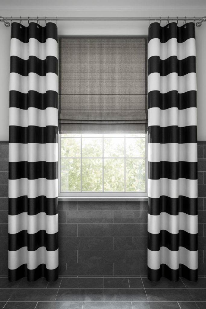 Bold Striped Curtains Combined With Roman Shades for a Chic Modern Bathroom